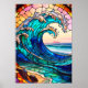 Capture the breathtaking energy of the Pacific with this "La Jolla Waves" professional art poster. Reimagined in a vibrant stained glass style, this piece features a majestic breaking wave composed of intricate sapphire, turquoise, and emerald glass textures. The design is elegantly framed by a lead-line arch that catches the golden glow of a coastal sunset. Printed on high-quality paper, this poster brings the translucent beauty of artisan glass into your home, making it an ideal statement piece for coastal-themed living rooms, beach houses, or modern offices. A perfect blend of traditional craftsmanship aesthetics and contemporary ocean art.
