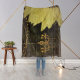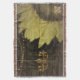 Feche a foto de um quarto de girassol com um processo digital envelhecido e dobrado com ouro, luzes de cordas reluzentes e candelabros, e uma abelha no canto inferior direito.