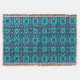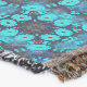 Um padrão caleidoscópico simétrico apresenta tons vibrantes de azul com acentos de contornos vermelhos e escuros. O intrincado design forma um motivo repetitivo, criando um efeito visual mesmerizante.