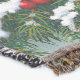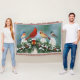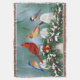Uma coleção de passarinhos em uma cerca coberta de neve decorada com a terra de Natal. As espécies de aves incluem o pássaro azul oriental, cardeais vermelhos nortes e frango de pele negra. A cerca é enfeitada com uma garland de Natal feita de galhos de pínus, cones e bagas ocas, acentuadas com sinos dourados e uma fita vermelha brilhante.