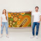 Uma design divertida com flores desagradáveis e um fundo de faixa retrô. Um design com abacate verde, castanho e laranja.