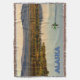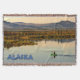 Sozinho na natureza. Uma canoa joga água espelhada do lago no interior do Alasca. Na distância típica de taiga e montanhas. A leitura de texto "Alaska" também é exibida. Esta imagem é derivada de uma fotografia do Serviço de Pesca e Vida Selvagem dos Estados Unidos.