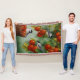 Aves no pomar de maçã durante a colheita do outono. Duas galinhas de cascas negras numa macieira, enquanto uma terceira miúda se senta num cesto de madeira tecido cheio de fruta madura, recentemente colhida, pronta a ser comercializada. Trabalho de arte realista criada de uma pintura original de petróleo pelo artista da vida selvagem Crista S. Forest.
