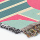 Este cobertor de lama tem uma design moderna do século médio de retângulos repetidos em rosa, lacre e azul com círculos dispostos em cima.