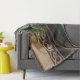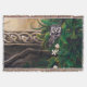 Homem Verde com uma coruja bonita amiga num galho de árvore. Nó celta trabalha em pedra atrás deles em uma parede