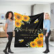 Um cobertor como presente de casamento ou guardar. Um chic Black e feliz sorriso de abelhas. Decorado com girassóis amarelos e laranja, flores e verde. Personalize e os nomes do casal. Cartas brancas. O texto: abelha feliz escrita com um estilo moderno, com letras grandes, escrito à mão, com traços.