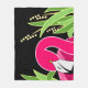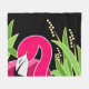 Arte flamingo rosa estilizada sobre fundo negro com folhagem verde decorativa