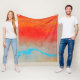 Um design abstrato de um pôr do sol oceânico com cores ousadas em vermelho, laranja, ciano, azul e bege.