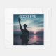 Esta imagem mostra a silhueta de um homem em água rasa com seu braço erguido em direção ao céu. O fundo mostra um pôr do sol sereno, com o horizonte misturando tons de rosa, laranja e azul profundo. A água calma reflete as cores do céu, criando uma atmosfera tranquila e sonhadora.