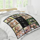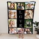 Uma colagem de fotos mantém um cobertor que sua família vai tesourar e curtir por anos. Você pode personalizar com dez fotos da família. "LOVE" é escrito verticalmente no meio em tipografia branca aberta contra fundo preto.