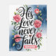 Celebre o amor inabalável de Deus por esta elegante tipografia aquarela com a frase 'Seu Amor Nunca Cheira, adornada com rosas vibrantes e um elegante estilo caligrafia audível e ousado. personalizado com o nome.