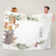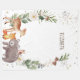 O design apresenta um grupo de adoráveis amigos florestais (veados, ursos, guaxinim, raposa, coruja) e verde-aquarela.