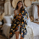 Um padrão intrincado de marmelos, amarelos e laranja As margaridas autóctones contra um fundo preto.