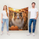Abraçar o charme rústico do outono com o nosso cobertor espantoso a mostrar um adorável Shetland Sheepdog num campo de colheita, à medida que o sol se põe no fundo.