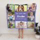 Um cobertor de velo roxo e costume para uma avó amada. Personalize com 8 fotos de seus netos, filhos, outros membros da família, animais de estimação, etc., personalize a expressão "Nós te amamos vovó" para "Eu te amo" e se ela é chamada de "vovó", "vovó", "mamã", etc., e adicione os nomes de seus netos, tudo em simples tipografia branca e roteiro modernos.