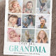 Uma manta quente personalizada de vovó, com um elegante pano de fundo branco que pode ser mudado para qualquer cor, um modelo de colagem de 9 imagens para você personalizar, o ditado "ama a vovó" em uma letra de gradiente de cor e os nomes dos netos.