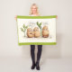 Engraçado trocadilho por causa das batatas. Um desenho de três batatas. A primeira pergunta: Por que chamamos de batatas? Não temos dedos dos pés. A terceira tem pés grandes com dedos grandes e diz: Falem por vocês. Limite de fundo do Verde limão.