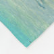 Um cobertor com uma fotografia de uma praia azul-turquesa de oceano com rochas grandes espalhadas ao longo da costa. Local tropical brilhante e ensolarado.
