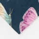 cobertor de velo com um belo padrão. Borboletas aquosas, pintadas em cores pastéis, incluindo rosa, roxo, azul, amarelo e verde. Fundo azul escuro.