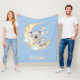 Este cobertor de velo personalizado apresenta um lindo coala bebê amaldiçoado dormindo em uma lua crescente com estrelas brilhantes sobre um fundo azul pastel branco.