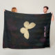 A imagem mostra um cobertor tecido com uma borboleta grande de ouro no seu centro sobre um fundo texturizado escuro com tons sutis de roxo e azul. O cobertor tem bordas franjas e inclui o texto personalizável de marcador de posição "texto" rosa ao longo do lado.