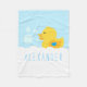 Quack, quack! A Borracha com o cobertor azul de velo do coração projetado pela Enchantfancy Design Company apresenta um pato amarelo bonito com um coração azul em sua asa. O pato de borracha amarelo está flutuando em bolhas de banho. Personalize com sua escolha de nome! Este cobertor faz um adorável presente para bebês.