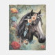 A horse's head with a lush mane. A beautiful brown horse among flowers.