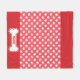 Este cobertor de velo tem um padrão de impressões de pata de cão branco em uma cor vermelha de fundo. O topo e o fundo têm bordas vermelhas mais escuras. Na parte inferior há também uma silhueta de osso de cão branco com uma área de texto personalizável para um nome.