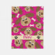 Este cobertor de velo apresenta um padrão de rostos sorridentes de cachorro com orelhas de disquete e ossos acentuados de cachorro sobre um fundo rosa brilhante. O texto personalizado permite adicionar o nome do seu cão.