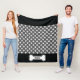 Este cobertor de velo tem um padrão de impressões de pata de cão branco em uma cor de fundo de cinza escura. O topo e o fundo têm bordas pretas. Na parte inferior há também uma silhueta de osso de cão branco com uma área de texto personalizável para um nome.