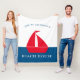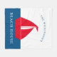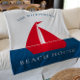 Um cobertor náutico vermelho, branco e azul, com um barco vermelho sobre um fundo branco e azul de blocos coloridos, com dois modelos de texto onde você pode adicionar seu nome de família e casa de barco, casa de verão ou até casa de algodão, muito fácil de personalizar e fazer dele seu próprio. se você quiser ajuda com este design, então por favor, entre em contato comigo através do botão de mensagens das minhas lojas o estúdio willow primavera e ficará feliz para ajudá-lo .