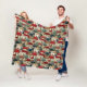 Lindo cobertor de flanela com uma imagem de uma aldeia rural de casas com telhados vermelhos, cogumelos vermelhos e lindas árvores de pinheiro, em um efeito de ponto de agulha.