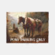 Esta obra de arte original tem pôneis com selas ocidentais amarrados a um trilho com as palavras "apenas estacionamento de pônei".