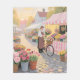 Uma encantadora rua europeia brilha sob a luz quente da hora dourada em um caminho de paralelepípedos. Uma mulher de avental marrom arranja um vibrante buquê ao lado de sua bicicleta com uma cesta cheia de flores, cercada por expositores transbordando rosas cor-de-rosa, tulipas, peônias e flores coloridas sob toldos listrados de rosa e branco. Esta ilustração alegre e nostálgica irradia calor, frescor e vibrações alegres de primavera.