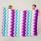 Um grande cobertor de velo com um belo e colorido design de chevrons em ameixa roxa, lilac, branco, minúsculo, turquesa e cinza.