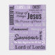 Jesus é um belo nome para um salvador maravilhoso. Significa "Deus que veio nos salvar". Aqui estão dezessete nomes usados na Bíblia para descrever Jesus. Inscrição moderna em preto e cinza com fontes na moda. Fundo roxo. Modelos fáceis de usar para adicionar (ou subtrair) texto.