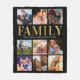 cobertor de pulgas de família editável com fundo preto na moda que pode ser mudado para qualquer cor, 9 fotos quadradas, a palavra "FAMÍLIA" em uma fonte de gradiente de folha de ouro na moda, mais o seu, seus parceiros e nomes de crianças.