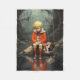 Um menino numa jaqueta vermelha senta-se numa rocha por um corpo de água silencioso e reflexivo, acompanhado pelo seu cão. O garoto parece triste e seu fiel companheiro está se comprometendo com ele. A cena está em uma floresta mística com um ambiente tranquilo. Digital Art Photoshop CS5
