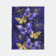 Composição de borboletas luxuosas de safira e joias de ouro em fundo azul texturizado.