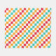 Alternating red, orange, teal, and white squares create a colorful, vibrant checkerboard pattern, conveying an energetic and playful tone.
