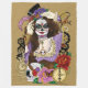 Dia vacilante da mulher morta vestindo maquiagem de açúcar. Vestido principalmente em roxo. À sua volta estão engrenagens, crânio, relógio, rosas e chaves.