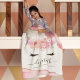 Cobertura personalizada de crianças com bordas de cristal cor-de-rosa e douradas, um rosto de unicórnio fofo com florais giros, o nome dos filhos em uma fonte elegante de caligrafia, e um ditado personalizado que pode ser apagado.