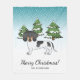 A ilustração original do desenho de Destei de um adorável cabelo curto, preto e um cão da raça Dachshund, de cor casaco bronzeada. O cão é colocado numa cena de inverno com três árvores de abeto verde e neve caindo. O fundo é um gradiente azul a branco que dá à design aquele olhar frio do dia de inverno. Há também uma área de texto personalizável que agora lê "Feliz Natal!" em uma bela fonte de script. Sob ela, há outra área de texto personalizável para um nome de família ou outro texto personalizado.