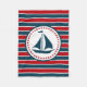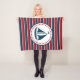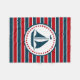 Design náutica com decoração de embarcações à vela em forma redonda com estrelas sobre fundo listrado vermelho, azul e branco