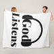 Este cobertor de velo apresenta as palavras "Deus escuta" em um impressão ousado com letras negras mostrando um conjunto de fones de ouvido sobre a frase que Deus escuta neste estilo e tema baseado na fé. Este cobertor é feito de um veleiro de 100% de tecido mole e confortável veloz velo de poliéster com impressão de cores vibrantes de borda a borda e costura de borda dupla com uma máquina de trás colorido esbranquiçada e lavável.