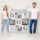 Um cobertor personalizado de guardas de animais de estimação com 4 fotos de você adorado cãozinho, um fundo de mármore elegante, letras que soletram DOG, as palavras "para sempre em nossos corações", uma pata de cachorros com um ditado de lembrança, e seu nome.
