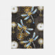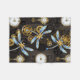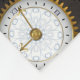 Marcadores e teclas antigas com engrenagens de ouro e latão, decoradas com libélulas mecânicas e boias em fundo castanho e listrado.