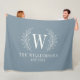 Um monograma bonito de folha de louros decora este cobertor de velo azul empoeirado. Faz um presente de excelente para um casamento ou aniversário.