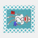 Enfermeira, macaco-meia-amontoado, boné de enfermeira vestindo macaco e estetoscópio. O fundo é azul com uma borda de bolinhas azul e branca. .
