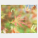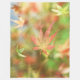 No cenário das folhas verdes de verão de um ácer japonês que fluía para vermelhos e amarelos do outono, uma folha de esqueleto de rosa e ouro desce lentamente para o chão.